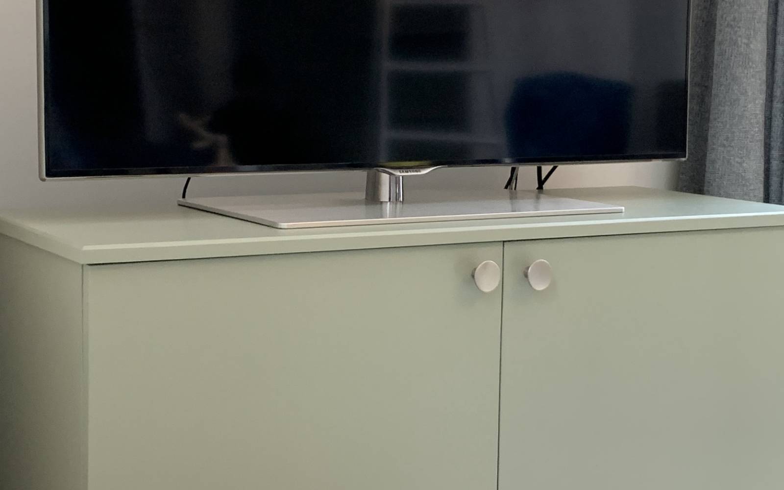 Pour l’agencement de la salle de bain de nos clients, nous avons créé un meuble de salle de bain sur-mesure en mélaminé chêne naturel avec des façades de portes et tiroirs en médium laqué coloris Railings de chez Farrow and Ball.