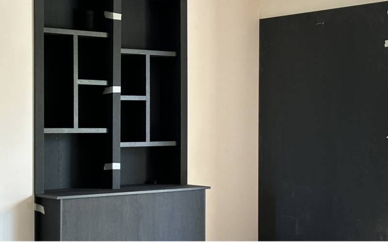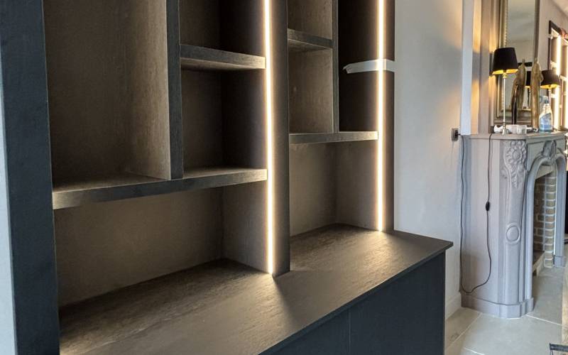 Ces ravissantes bibliothèque sur mesure en placage noir ont été réalisées dans nos ateliers situés près de Roanne et livrées chez nos clients à Lacenas près de Lyon. Cette création, pensée pour un espace haut de gamme, illustre parfaitement notre savoir-faire en matière d'agencement sur mesure.