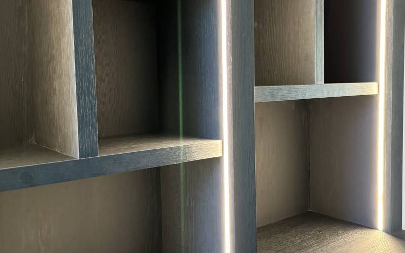 Des éclairages leds dans les montants de la partie haute viennent sublimer la mise en lumière de ces bibliothèque sur mesure en placage noir à Lacenas près de Lyon. L'éclairage joue un rôle clé dans la mise en valeur d'une bibliothèque. Nous intégrons des LED discrètes dans les montants apportant une lumière douce et indirecte.