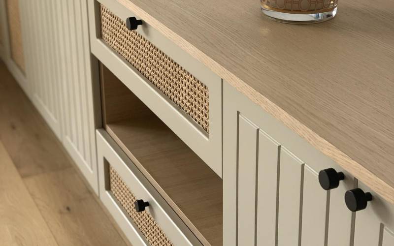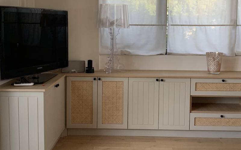 Notre cliente souhaitait également intégrer le cannage à son projet de meuble de télévision sur mesure ce que nous avons fait sur certaines façades de portes ou tiroirs tout en restant harmonieux dans l’ensemble du projet.