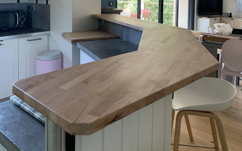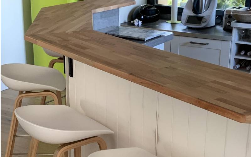 Pour finir l’agencement de son salon, notre cliente nous a demandé d’harmoniser son espace bar avec l’ensemble de meubles du salon sur mesure. Nous avons changé son plateau en optant pour un plateau en tri plis hêtre et nous avons habillé les façades avec des joues de la même finition que les façades de portes du meuble salon.
